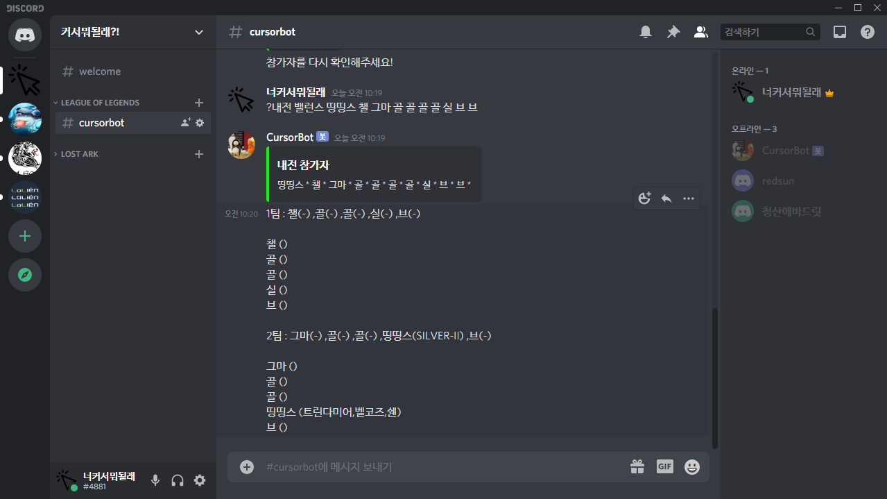프로젝트에도 기존 항목 추가로 RiotSharp.cproj 를 추가해주고, Discord Bot Tutorial의 소스를 살짝만 응용하게 되면 이런식으로 내전 팀을 짜는 봇을 만들 수 있습니다.