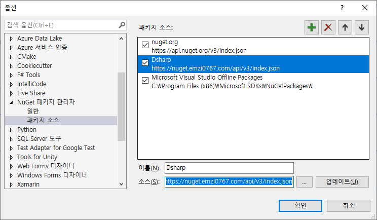 설치 전, 위의 메뉴를 클릭하여 옵션에서 패키지 소스 경로 하나를 추가합니다.