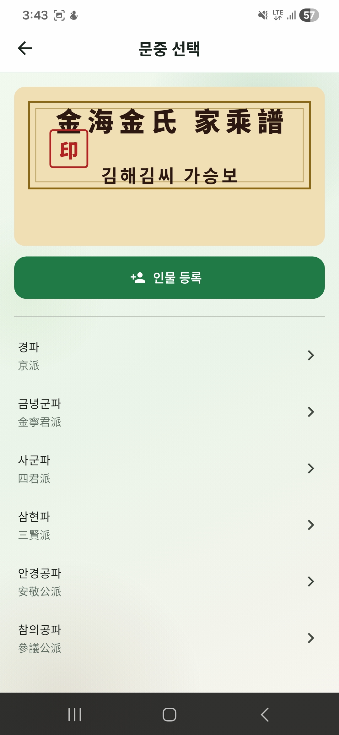 - Alt: 문중과 분파를 선택해 가계도 관리 여정을 시작하는 화면