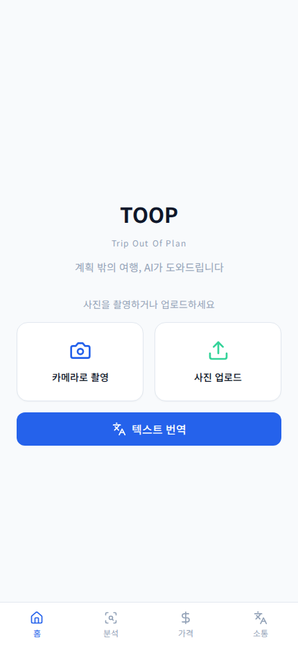 사진 한 장에서 번역과 다음 행동까지 이어지는 TOOP의 메인 시작 화면